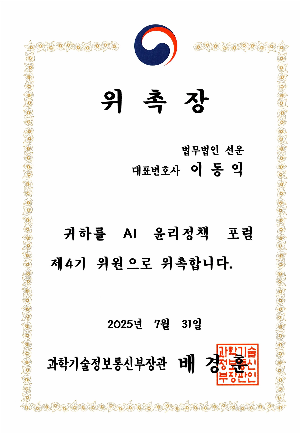 이동익 변호사 AI 윤리정책 포럼 제4기 위원 위촉