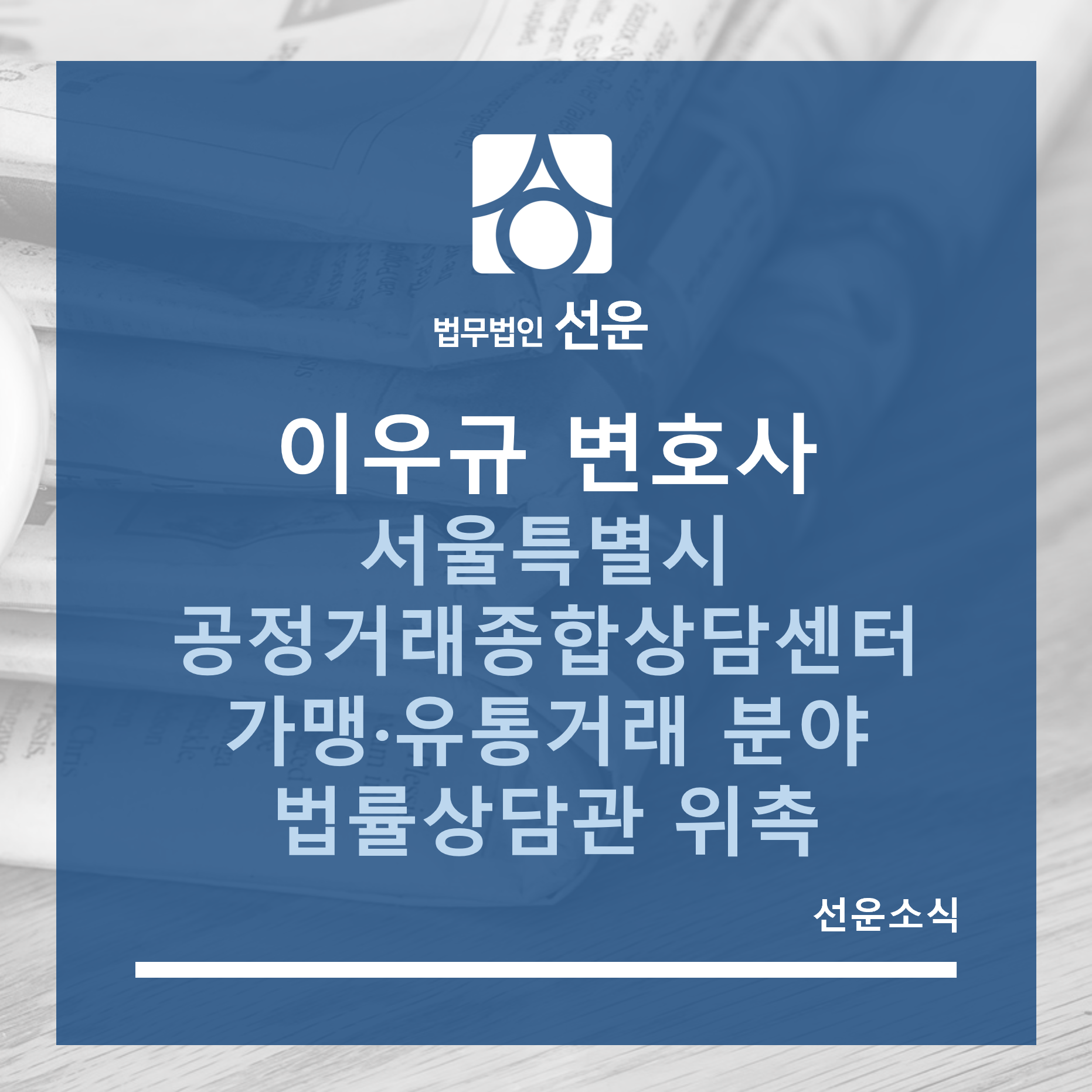 선운소식이우규 변호사, 서울특별시 공정거래종합상담센터 가맹·유통거래 분야 법률상담관 위촉이우규 변호사는 2025. 9. 1. 서울특별시 공정거래종합상담센터 가맹·유통거래 분야 법률상담관으로 위촉되었습니다.서울특별..2025.09.12