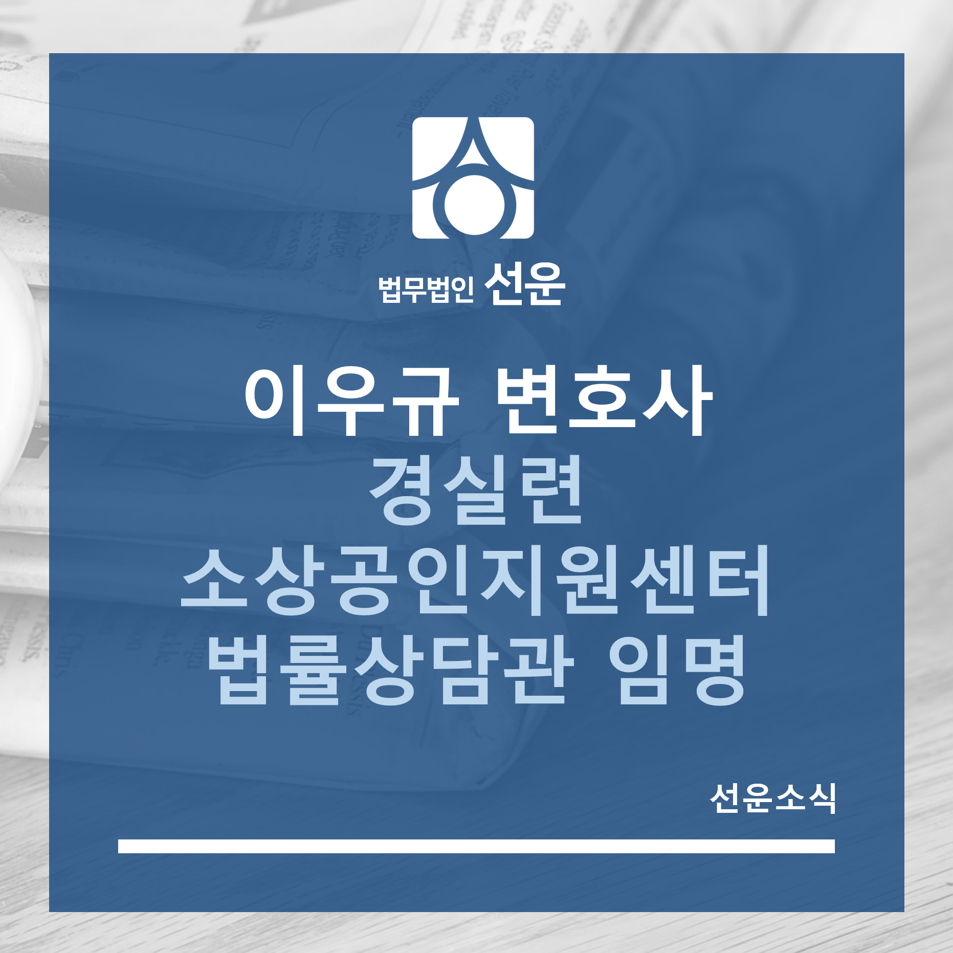 선운소식이우규 변호사, 경실련 소상공인지원센터 법률상담관 임명이우규 변호사는 2025년 9월 16일 경실련(경제정의실천시민연합) 소상공인지원센터의 법률상담관으로 임명되었습니다.경실련 소상..2025.09.18 -