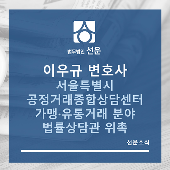 이우규 변호사는 2025. 9. 1. 서울특별시 공정거래종합상담센터 가맹·유통거래 분야 법률상담관으로 위촉되었습니다.
