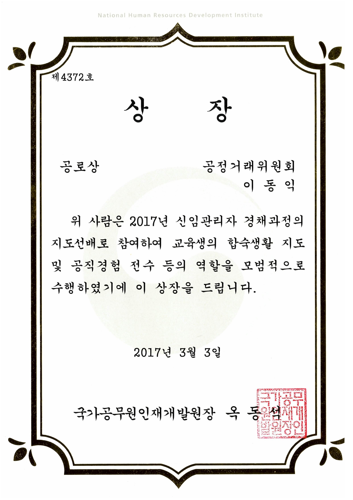 이동익 변호사 신임관리자 경채과정 교육생 학습생활 지도 및 공직경험 전수 공로상