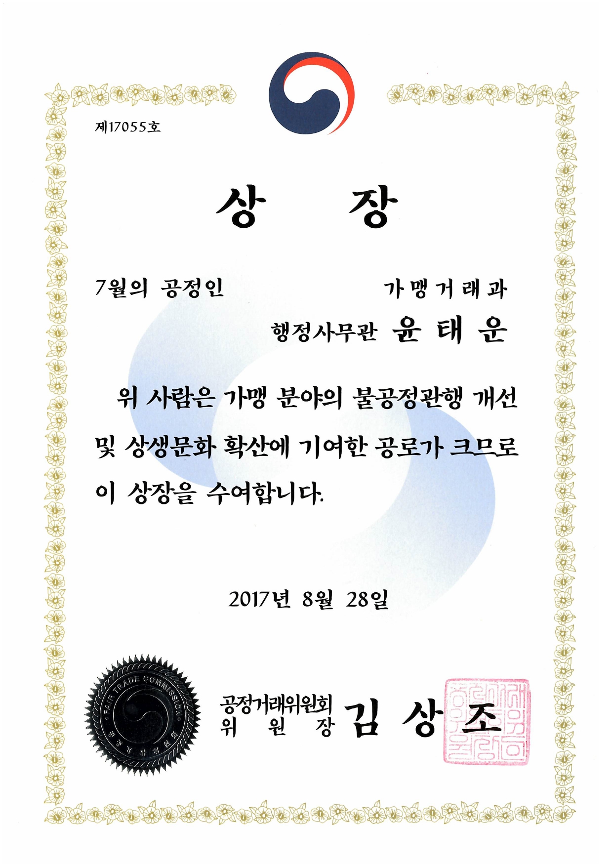 윤태운 변호사 2017년도 2분기 민원처리 우수공무원 공로상