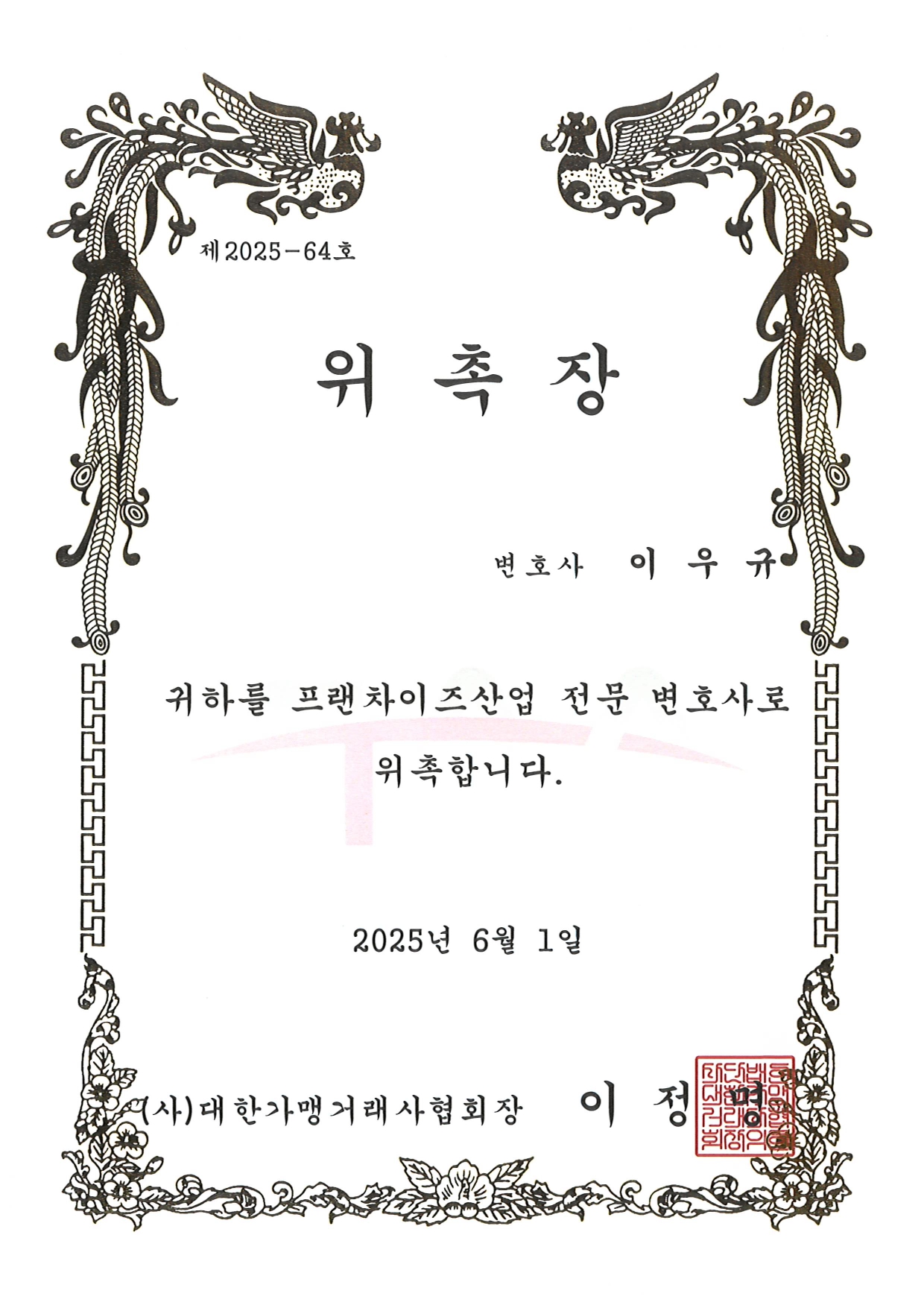 이우규 변호사 프랜차이즈산업 전문 변호사 위촉