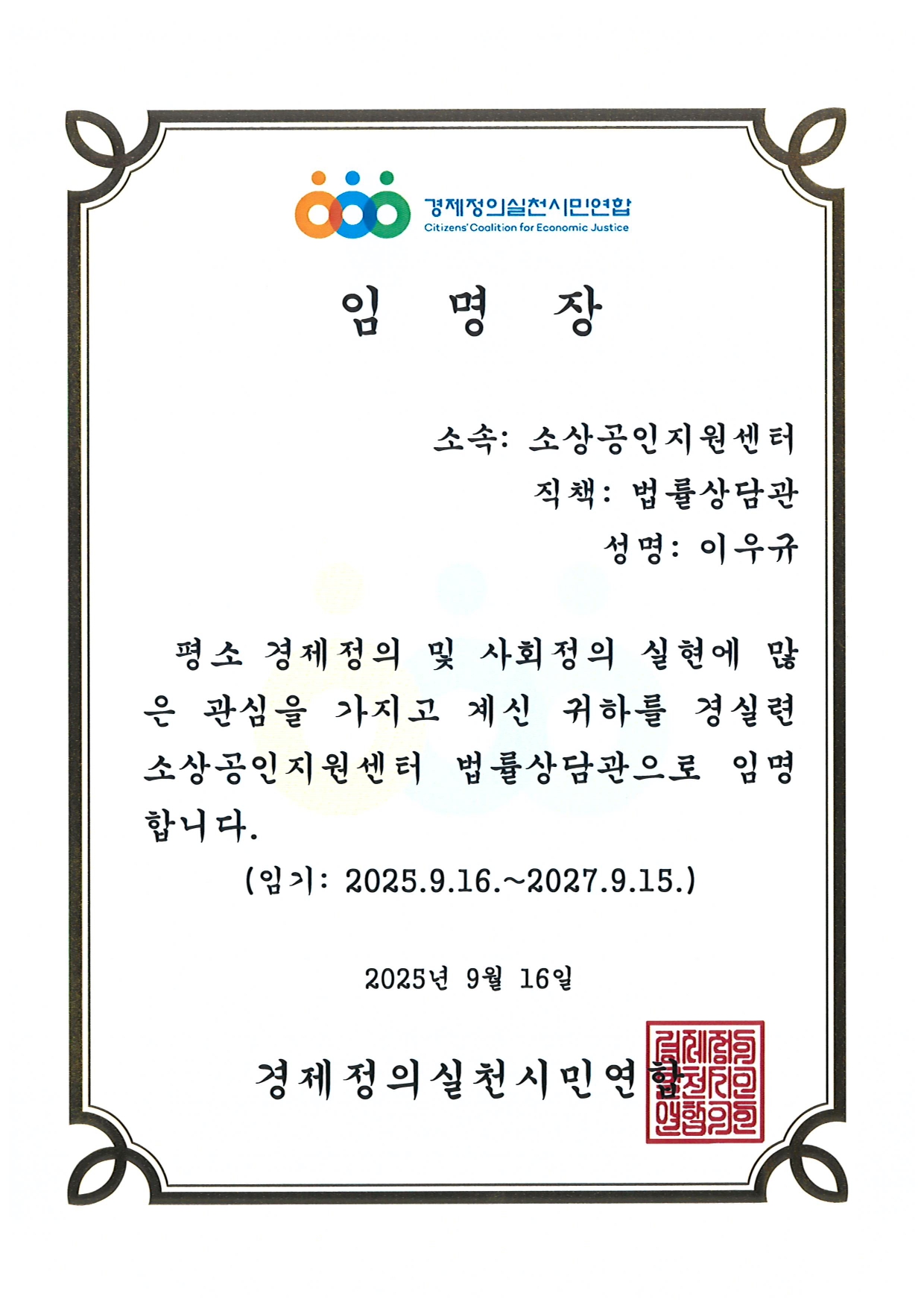 이우규 변호사 경실련 소상공인지원센터 법률상담관 임명
