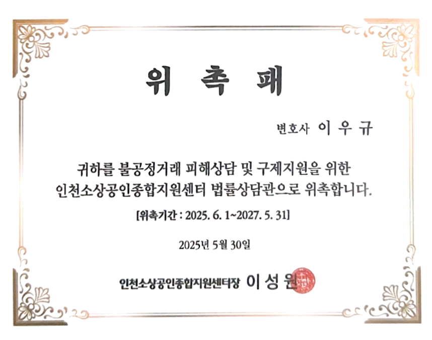 이우규 변호사 인천소상공인종합지원센터 법률상담관 위촉