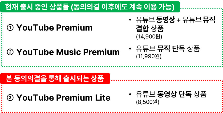 아울러유튜브 라이트가 출시되더라도 기존의 구독제 상품인 유튜브프리미엄과유튜브뮤직프리미엄에는 아무런 변화가 없으며동 상품들을 이용하기를 원하는소비자들은 계속해서 구독할 수 있습니다