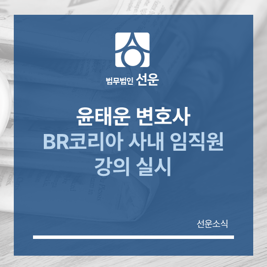 선운소식윤태운 변호사, BR코리아 사내 임직원 강의 실시법무법인 선운의 윤태운 변호사는 11월 26일 BR코리아 임직원을 대상으로 가맹사업 관련 규제동향과 실무적 대응전략을 주제로 ..2025.11.26 -