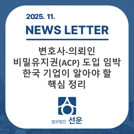 선운소식[선운 뉴스레터] 변호사-의뢰인 비밀유지권(ACP) 도입 임박한국 기업이 알아야 할 핵심 정리[법무법인 선운 11월 뉴스레터]최근 한국 정부가 2025년 11월 한미 공동 팩트시트를 통해 경쟁 절차에서의 ACP(At..2025.11.28 -