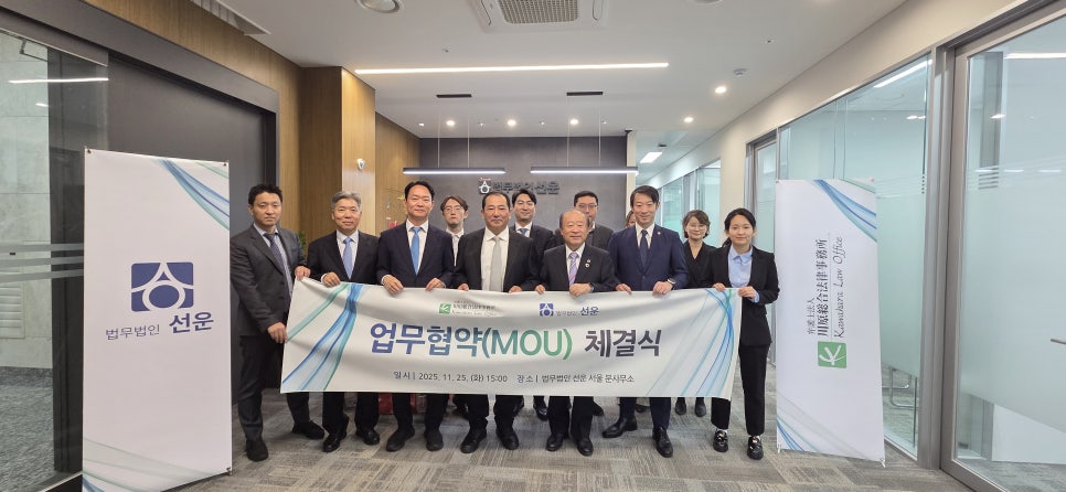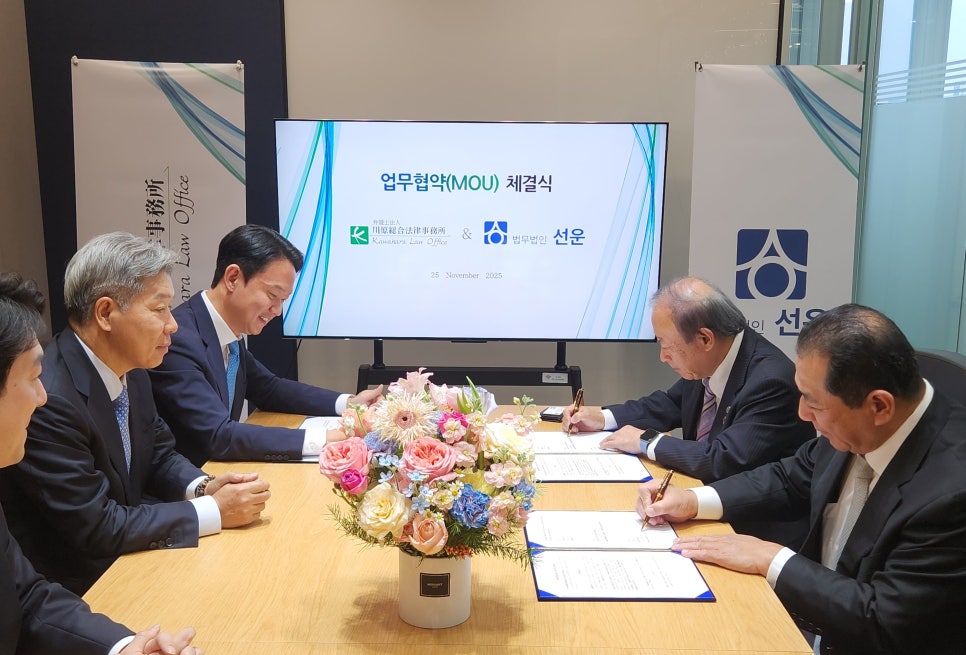 법무법인 선운(대표변호사 이동익)은 한·일 간 법률 서비스 협력 강화를 위해 11월 25일 법무법인 선운 서울 분사무소에서 가와하라 법률사무소(Kawahara Law Office)와 업무협약을 체결하였습니다.