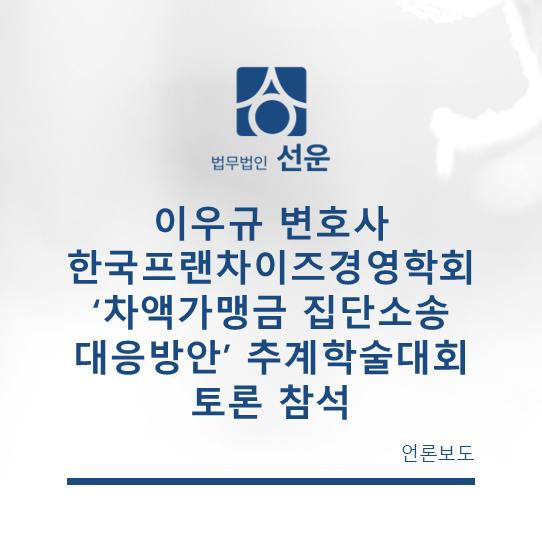 언론보도이우규 변호사 한국프랜차이즈경영학회 ‘차액가맹금 집단소송 대응방안’ 추계학술대회 토론 참석[법무법인 선운] 이우규 변호사는 2025년 12월 13일, 한국프랜차이즈경영학회가 주최한 추계학술대회에 종합토론 패널로 ..2025.12.18 -